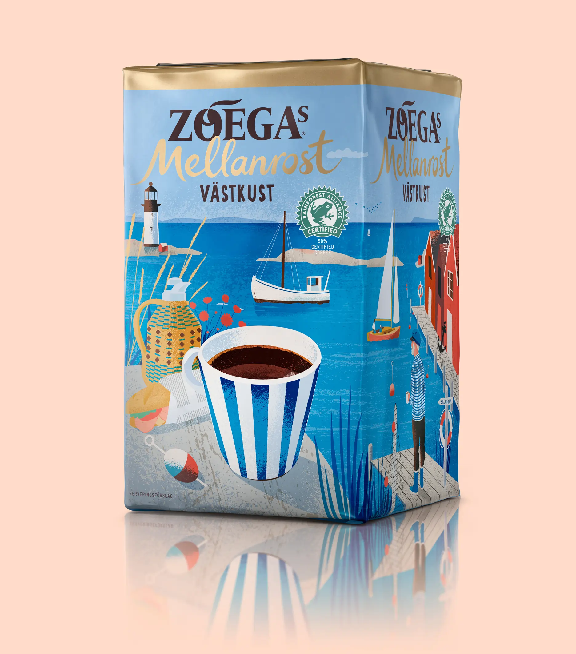 To strengthen shelf impact and stand out among competitors, most of whom focus on medium roast coffee, we created a bold new design for Zoégas Medium Roast. Our team developed the packaging concept and idea, while the illustrations were crafted by Jens Magnusson.
